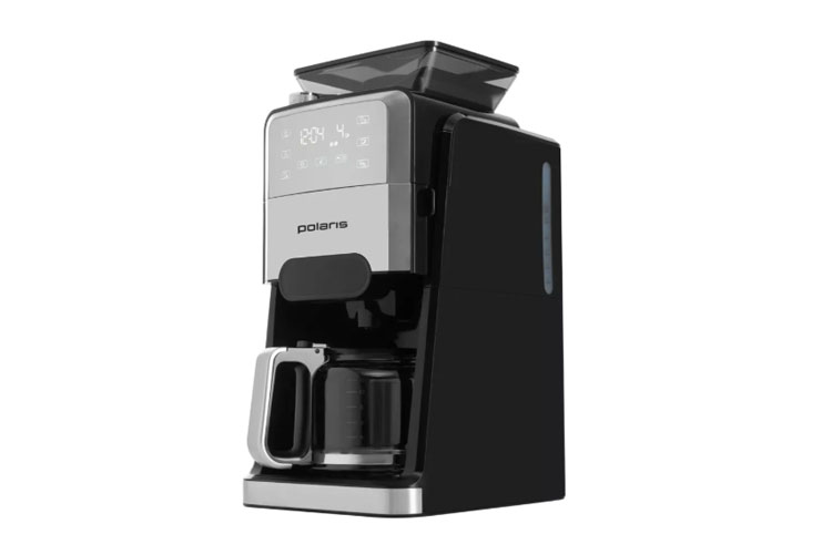 Polaris PCM 1250 — отличная капельная кофеварка, которая сама мелет и варит кофе. Можно использовать как зёрна, так и молотый кофе. В неё помещается 1,5 литра воды (это 12 чашек), а управляется она через сенсорную панель. Можно настроить автоматическую остановку, есть индикатор, когда вода заканчивается, и функция подогрева с четырьмя настройками времени (от 30 минут до 2 часов).